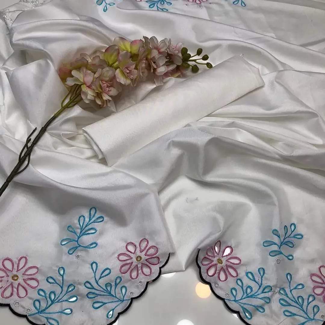 Description 2 pcs Qattan silk unstitched cut work embriodery shirt Work on damman and sleeves Qattan silk plain trouser 4 guz ka suit (bara bar) 2 pcs Shirt and trouser