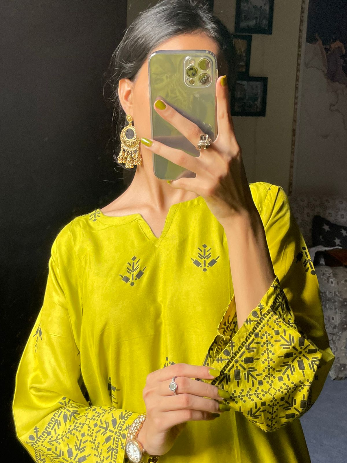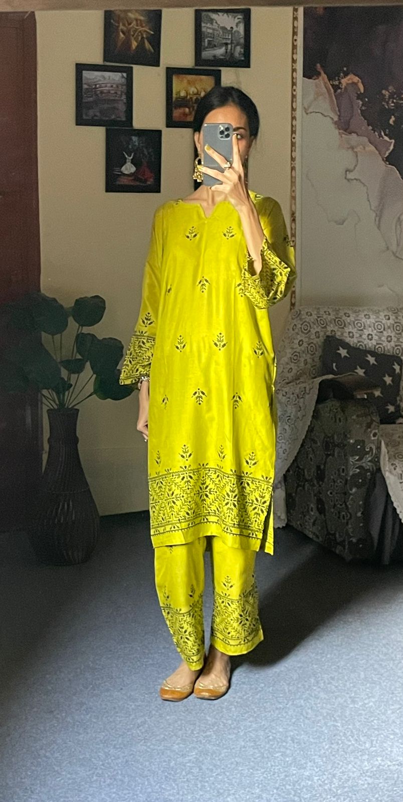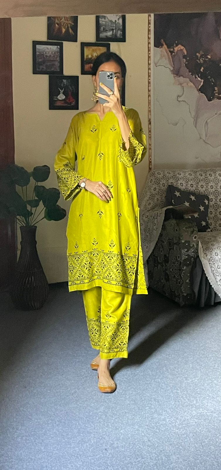 2pcs Block Printed Arrow Design Women's Suit (Mehandi)