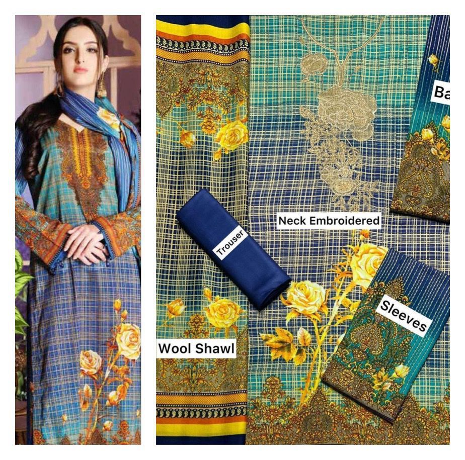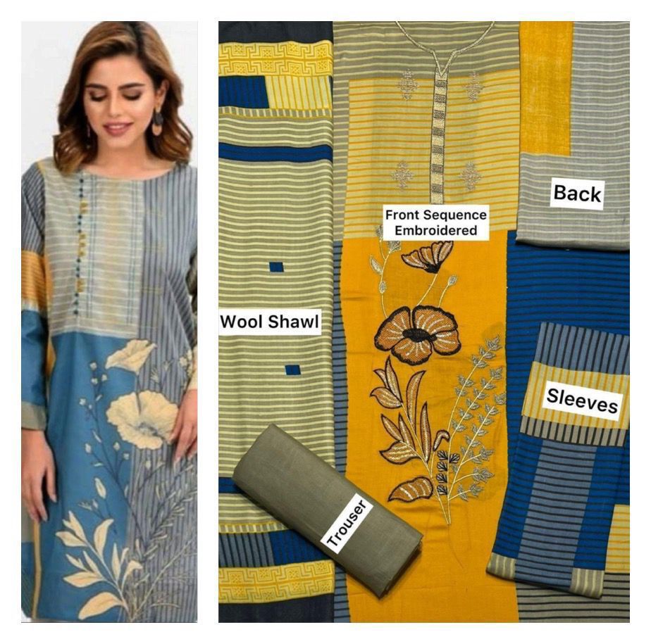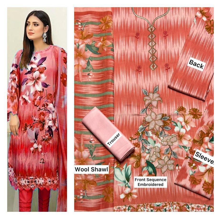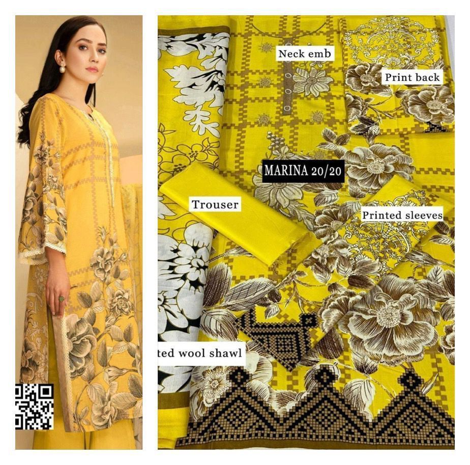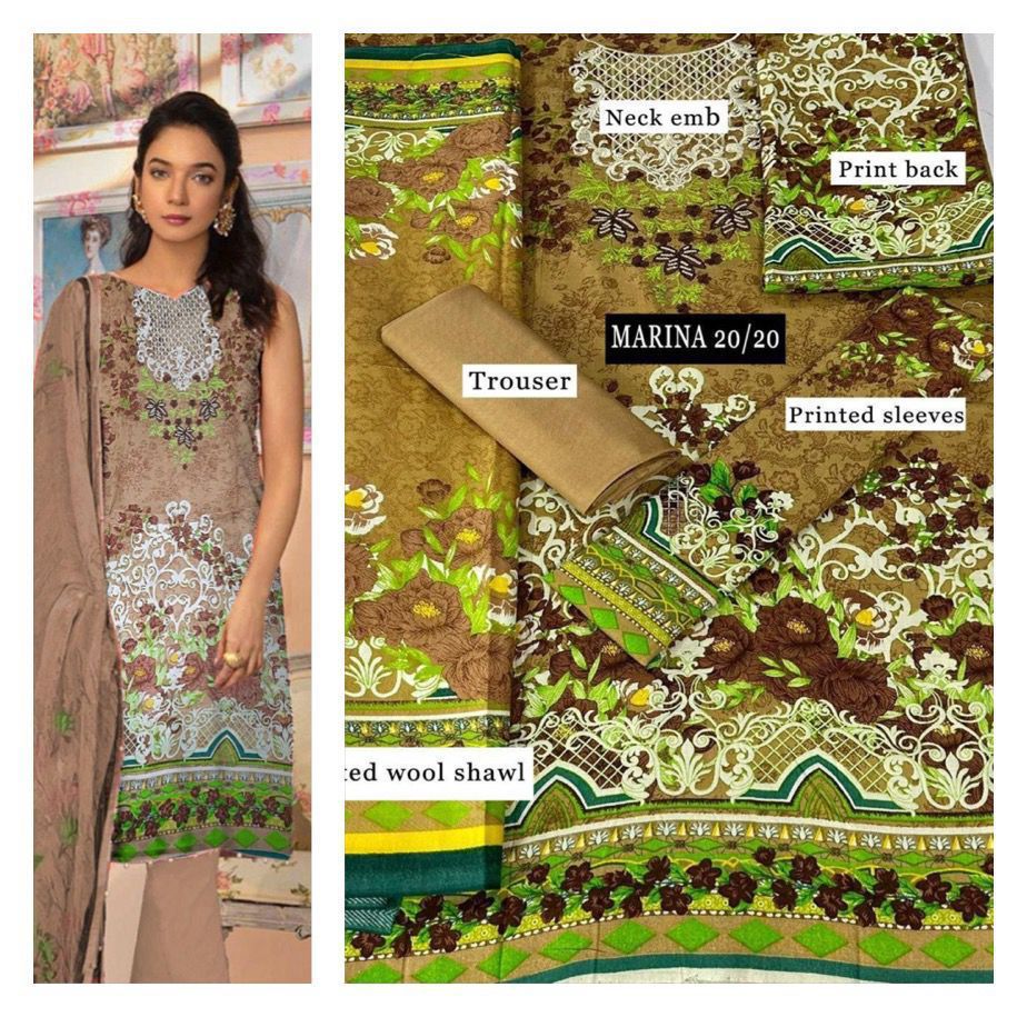 MARINA collection Fabric: Marina 3pc unstitched marina Suits FRONT FULL PRINTED HEAVY NECK EMBROIDERED DYED MARINA TROUSER BACK AND SLEEVES PRINTED PRINTED Wool Sha