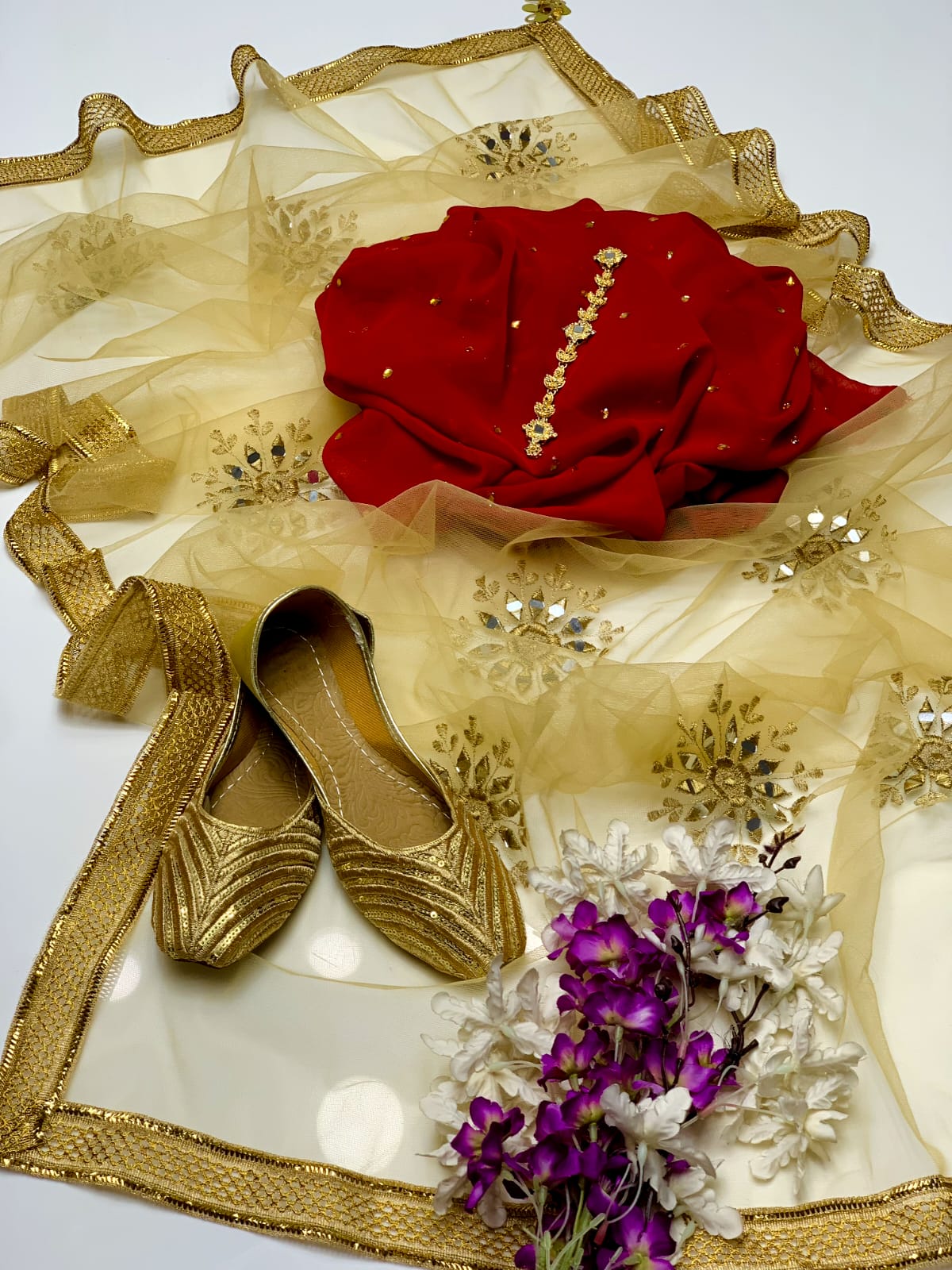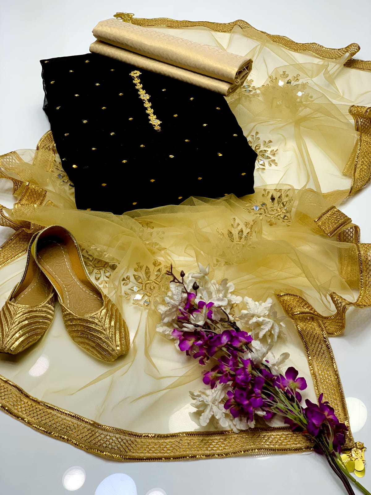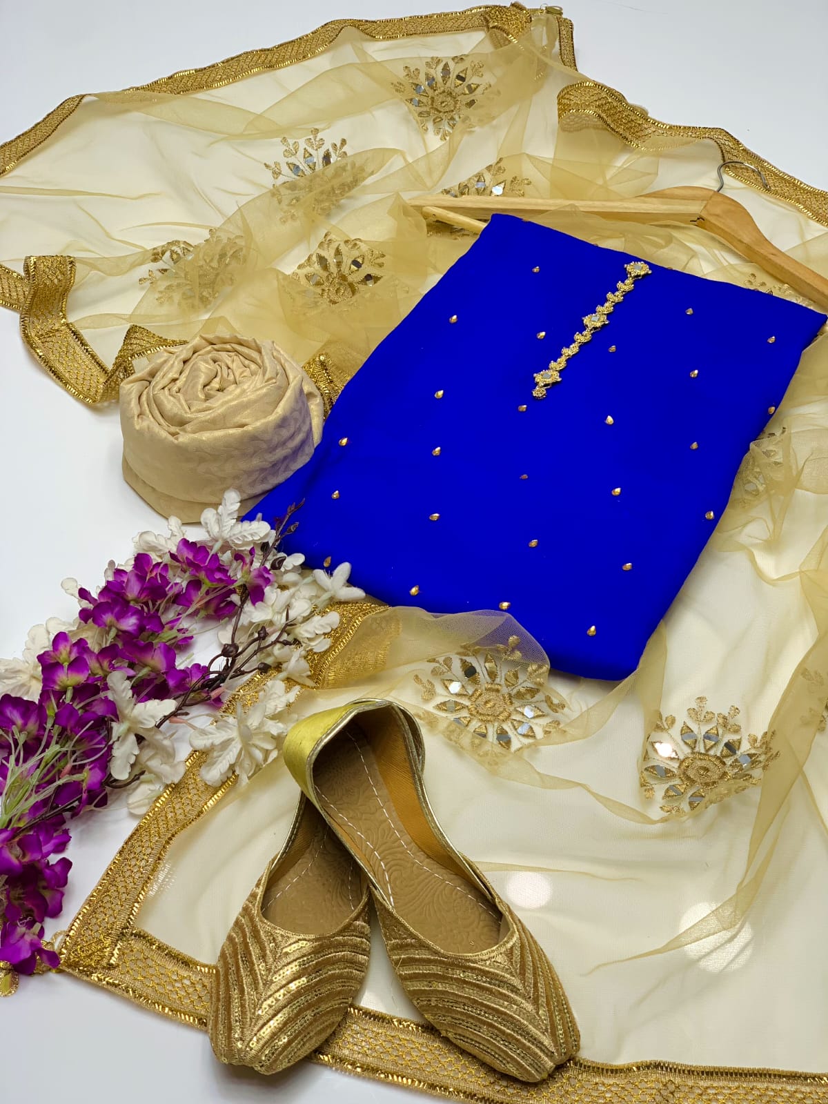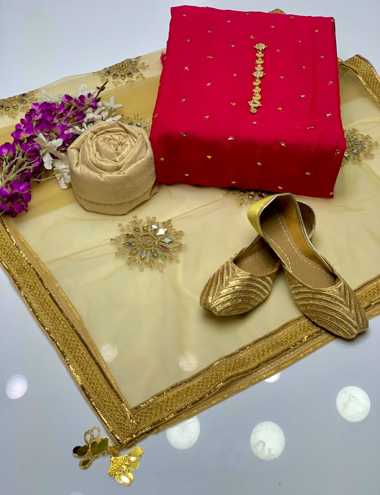 4 pcs Krinkal chiffon nug work Unstitched shirt Net mirror work dupata Meauri trouser Neck line Khussa