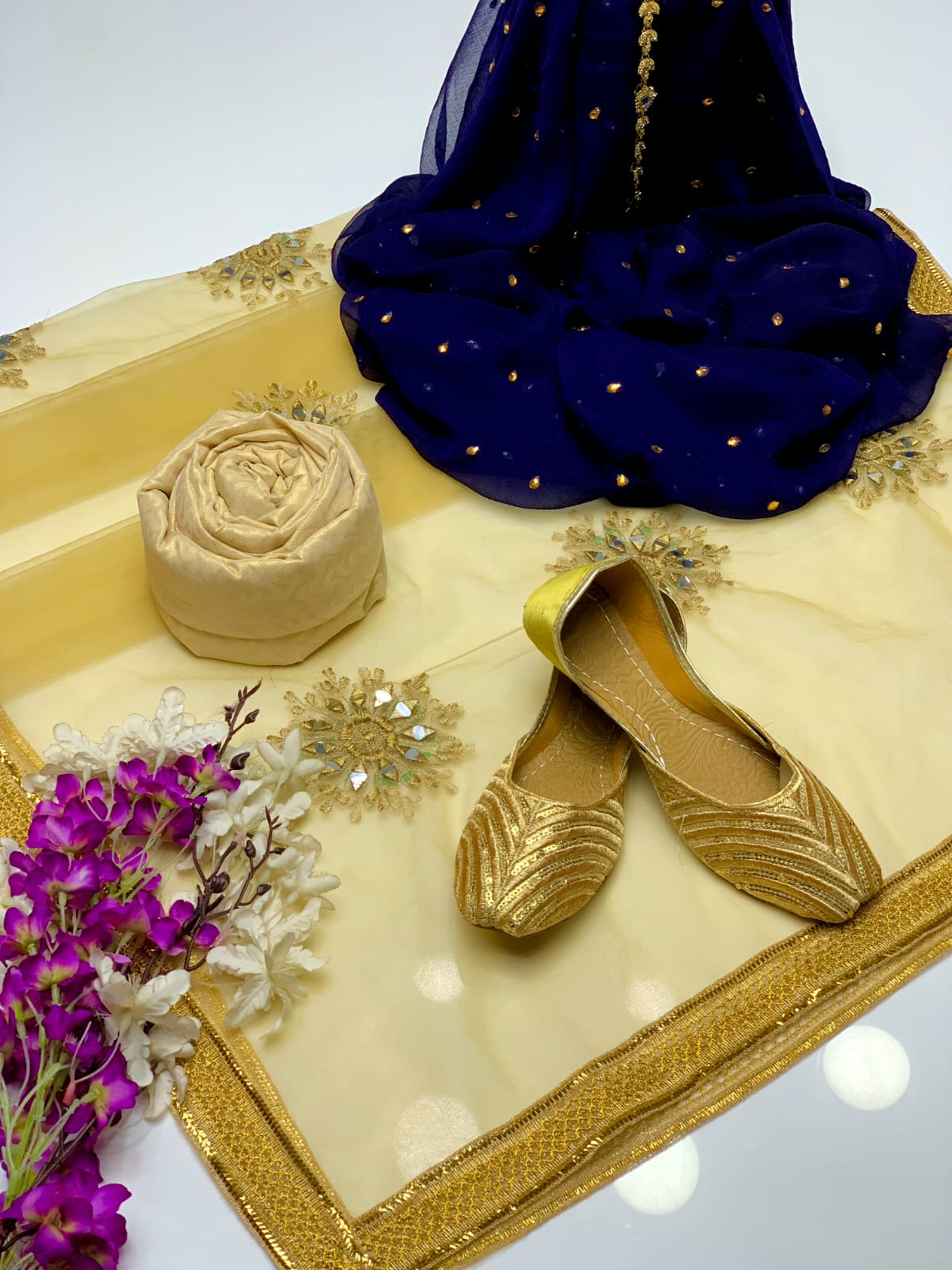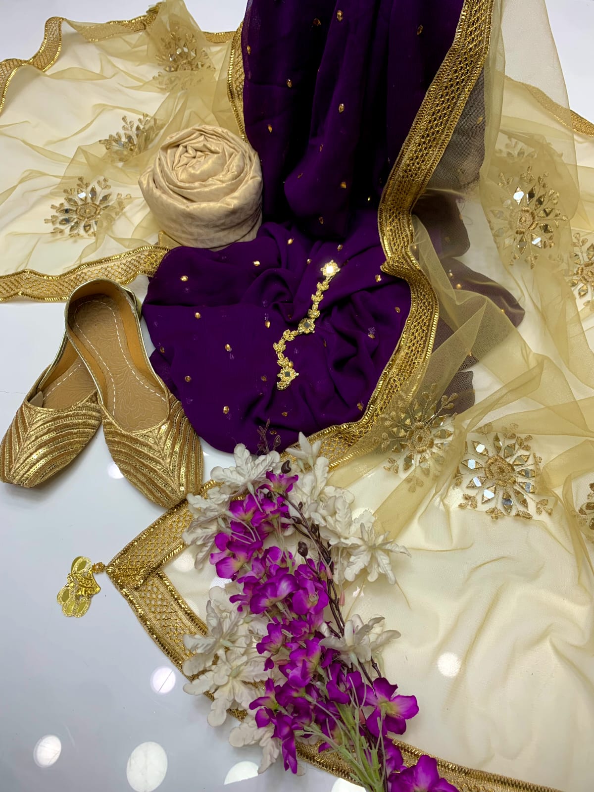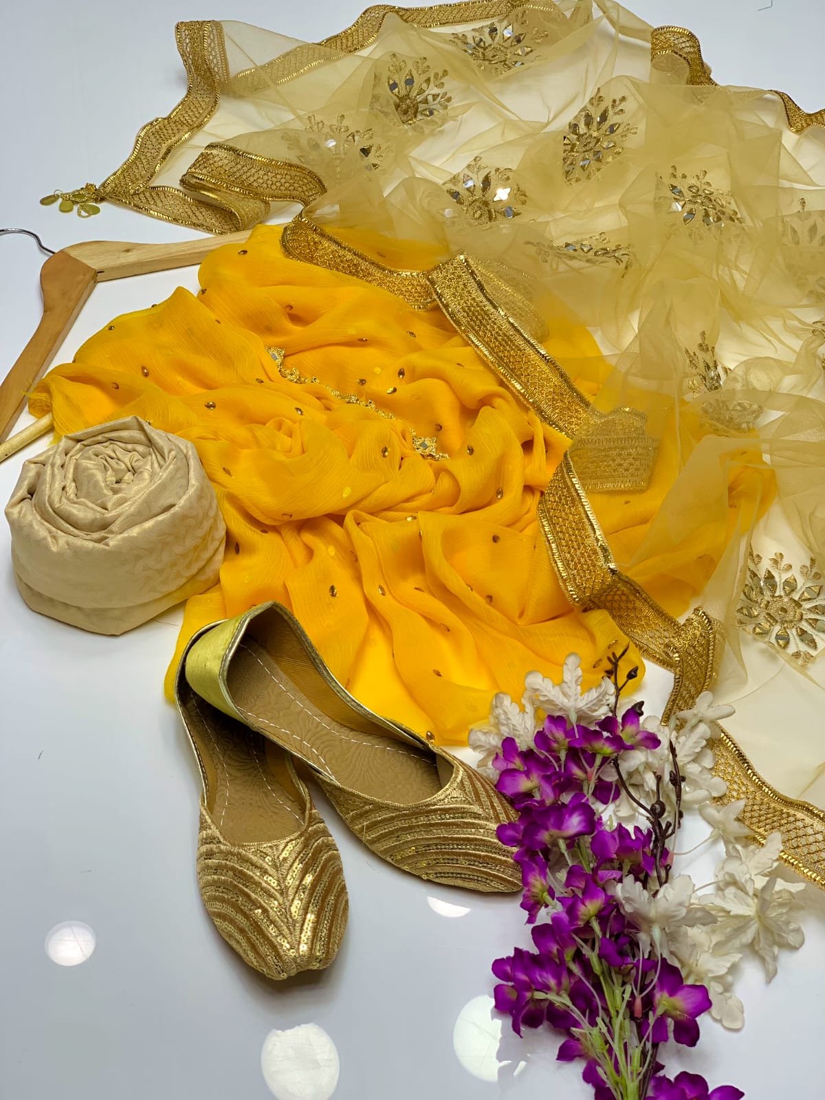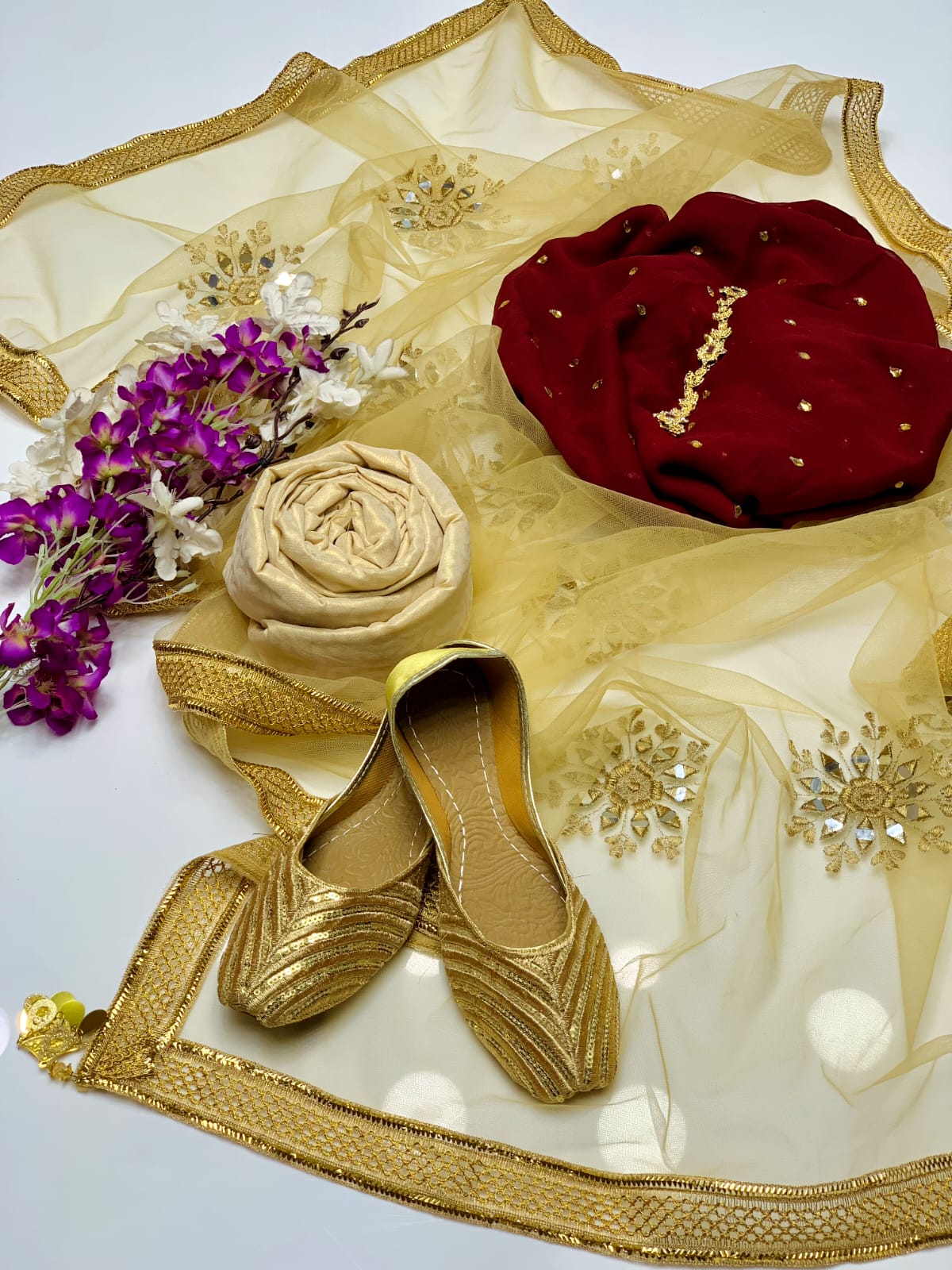 4 pcs Krinkal chiffon nug work Unstitched shirt Net mirror work dupata Meauri trouser Neck line Khussa