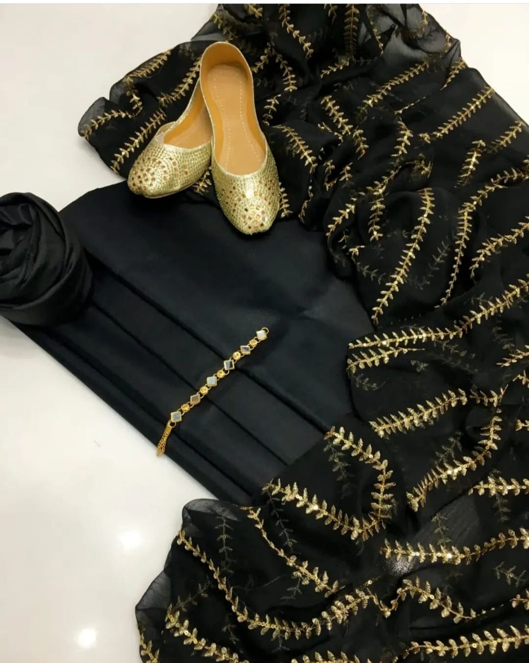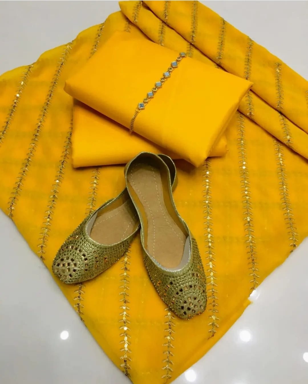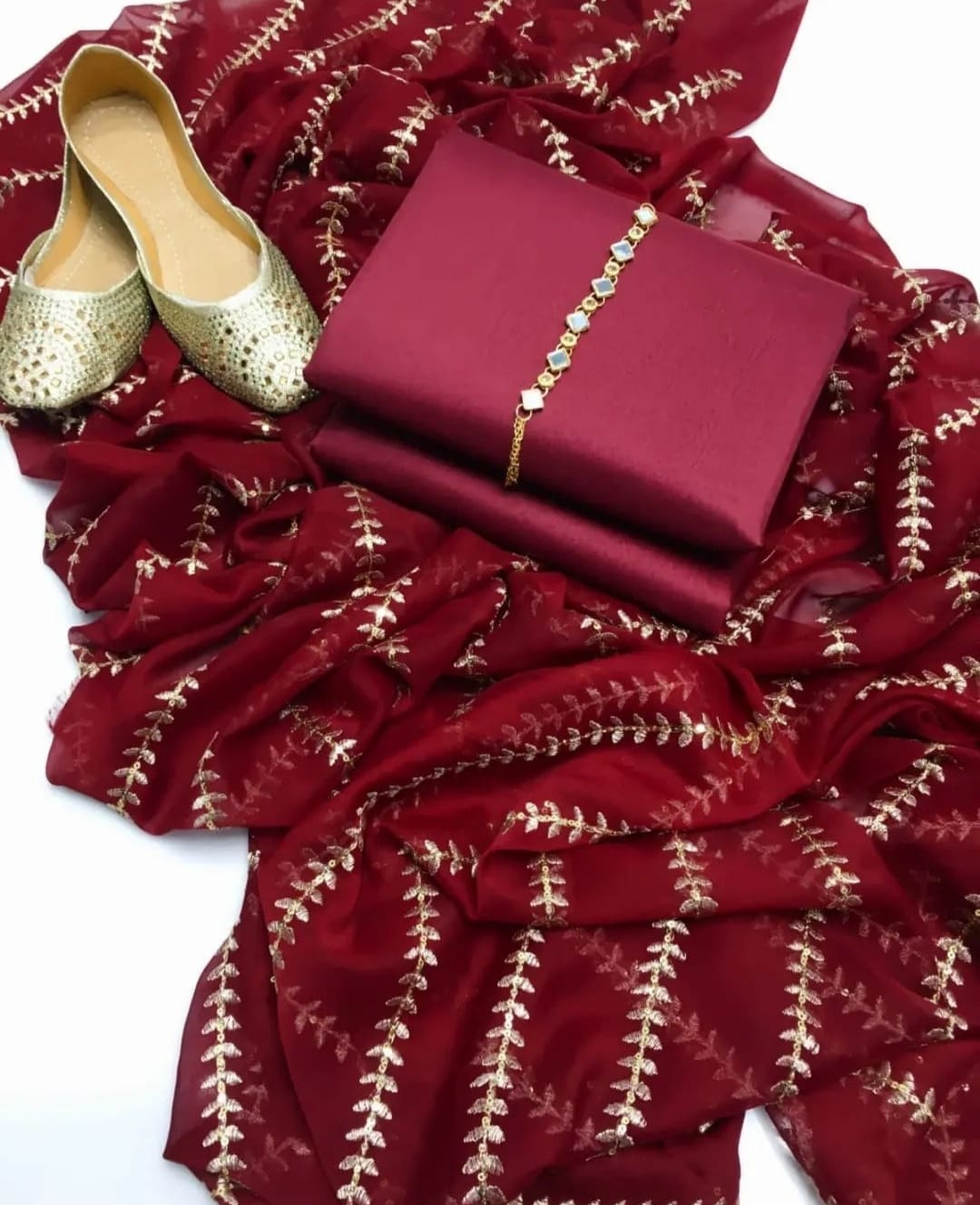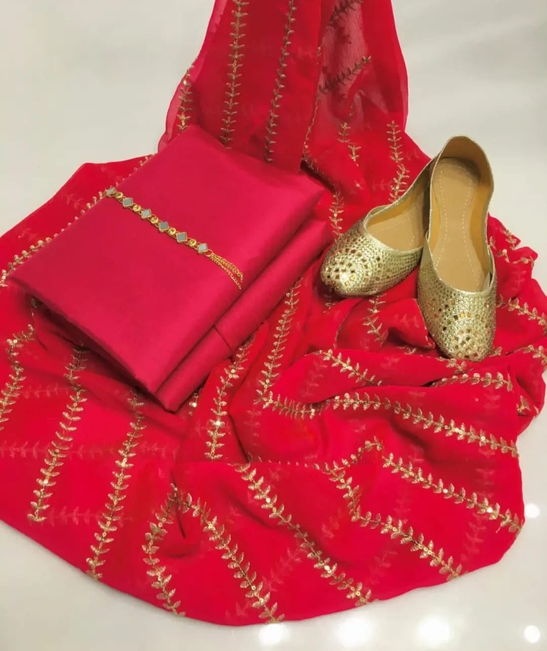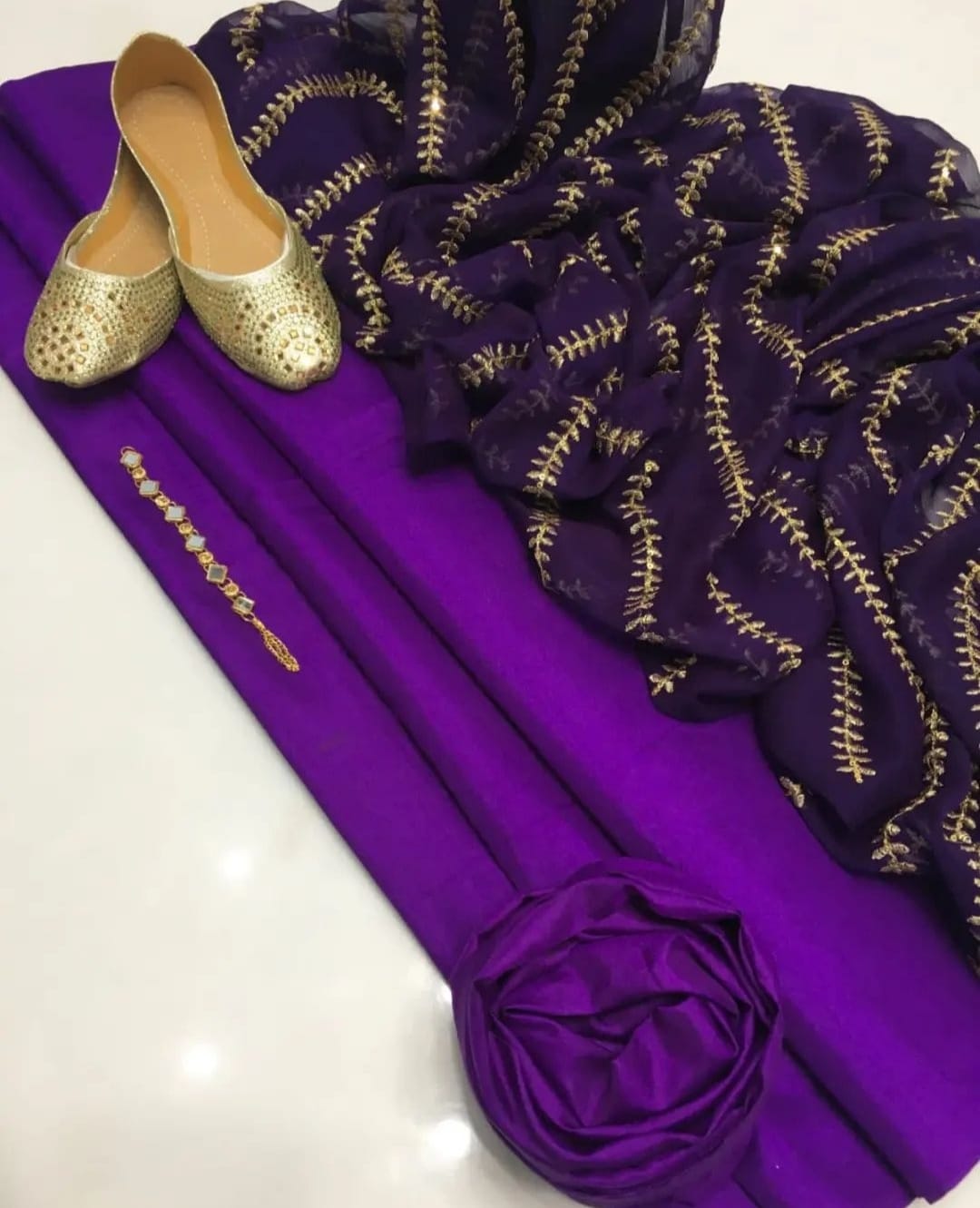 4 pcs Qattan silk suit with krinkal chiffon embroidery dupata Neck line with Khussa (unstitched)