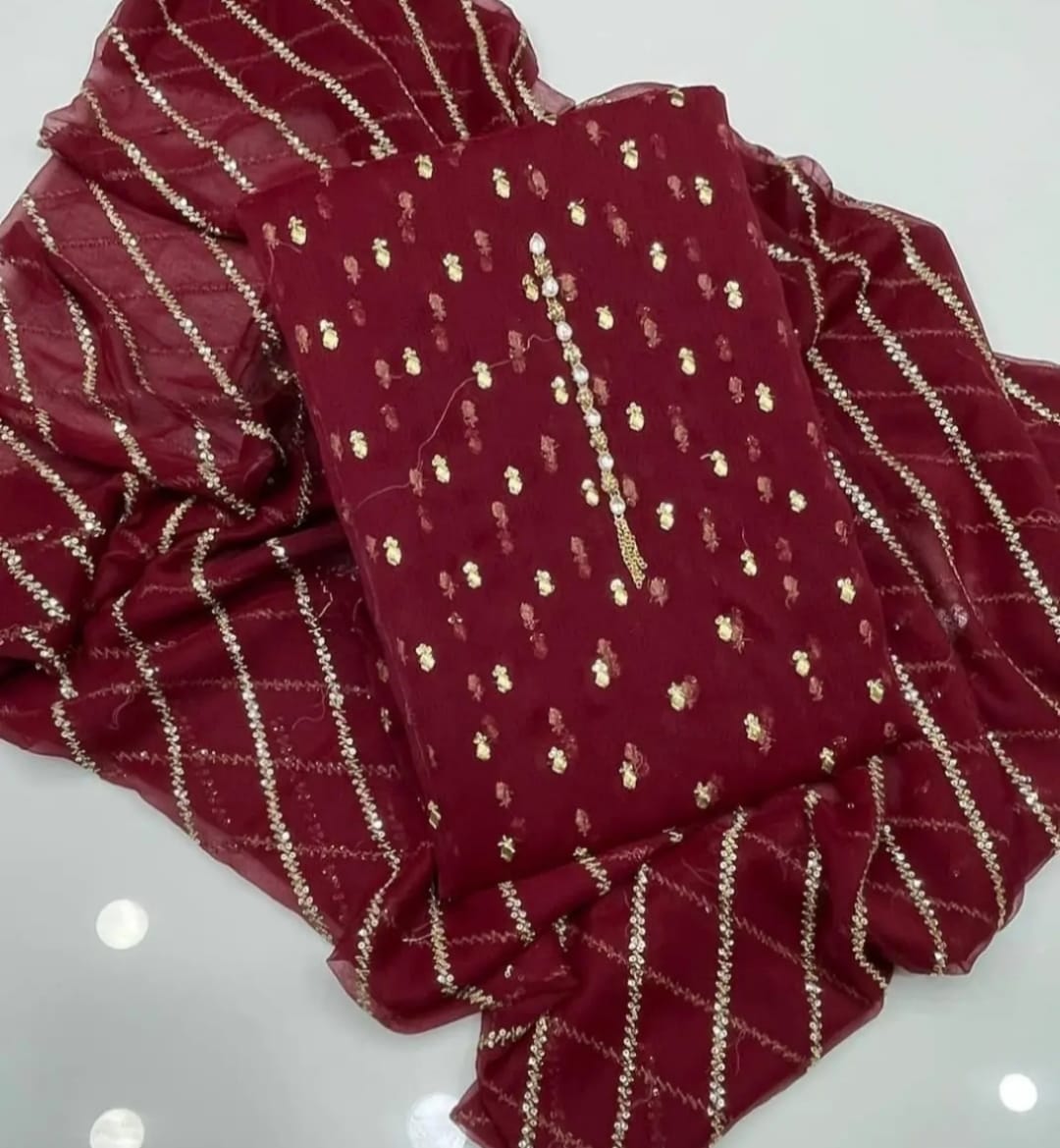 Crinkel chiffon emb shirt Crinkle chiffon heavy emb dupata Meauri trouser Neck line