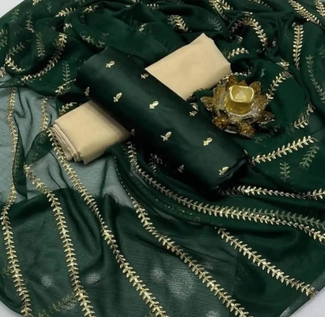 Description Crinkel chiffon emb shirt Crinkle chiffon heavy emb dupata Meauri trouser Neck line 2.5 guz shirt 2.5 guz dupatta 2.5 guz trouser