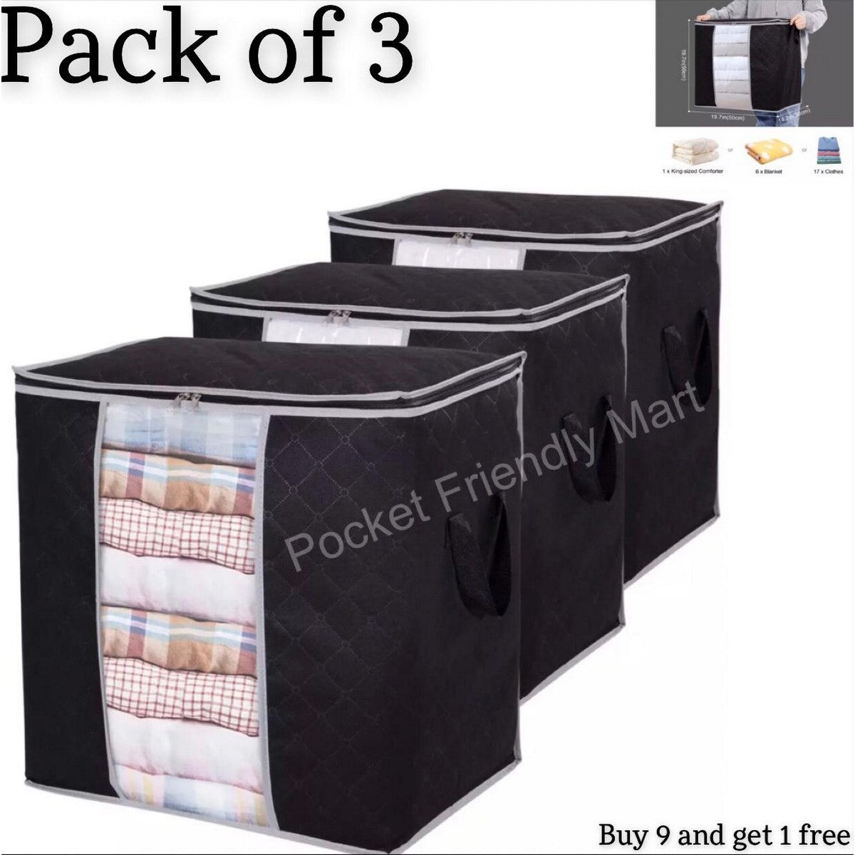 Pack Of 3 - 110gsm New Waterproof Home Storage Bag foldable non woven Oxford Cloth Bedding Suits Pillows Closet Organizer bags Organizer Zipper Bag (Random Color)
