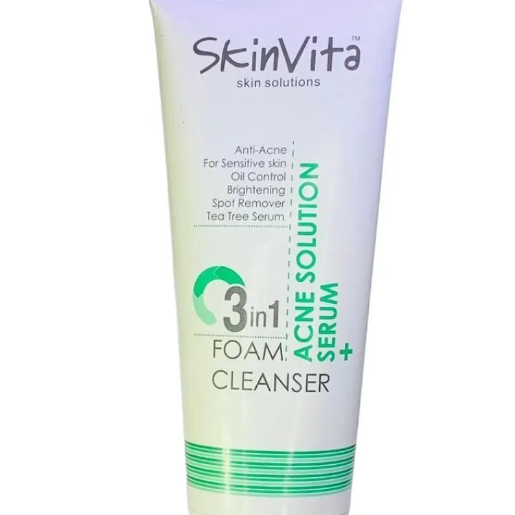 - SkinVita Acne Solution Serum +Foam Cleanser 150ml is the latest product which mixes cleansing foam with tea tree serum. This face wash helps your skin control oil and reduces acne outbreak. At the same time, it helps brighten your skin and reduce dark spot. Skinvita Acne Solution Serum +Foam Cleanser is Dermatologist Tested.