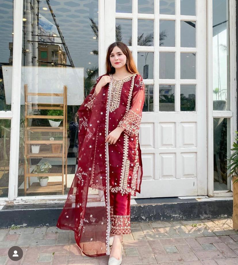 Details: 🎗️ Stitched 3pcs 🎗️ Organza Shirt with attached inner 🎗️Shirt/Dupatta/trouser Size: 🎗️Medium: Chest 21 , Length 37 🎗️Large: Chest 23 , Length 37 🎗️ Fabric: Organza 🎗️Kattan silk trouser & innerShare